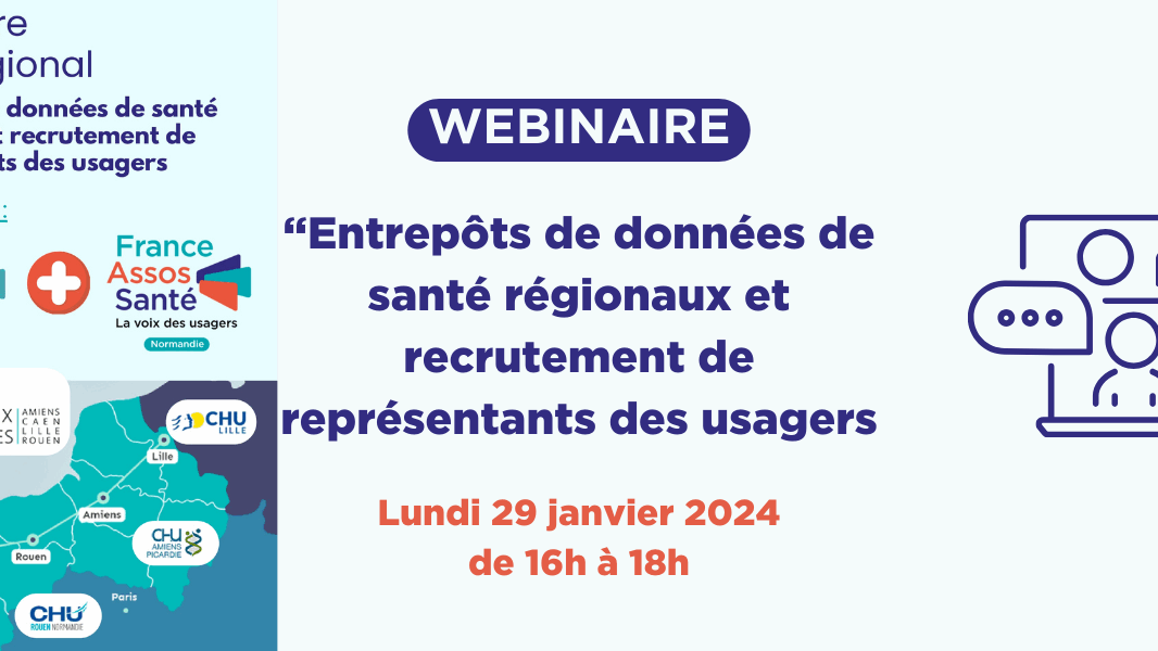 En collaboration avec France Assos Santé Normandie, nous vous proposons un Webinaire sur « Les Entrepôts de Données de santé et le recrutement de représentants des usagers »: